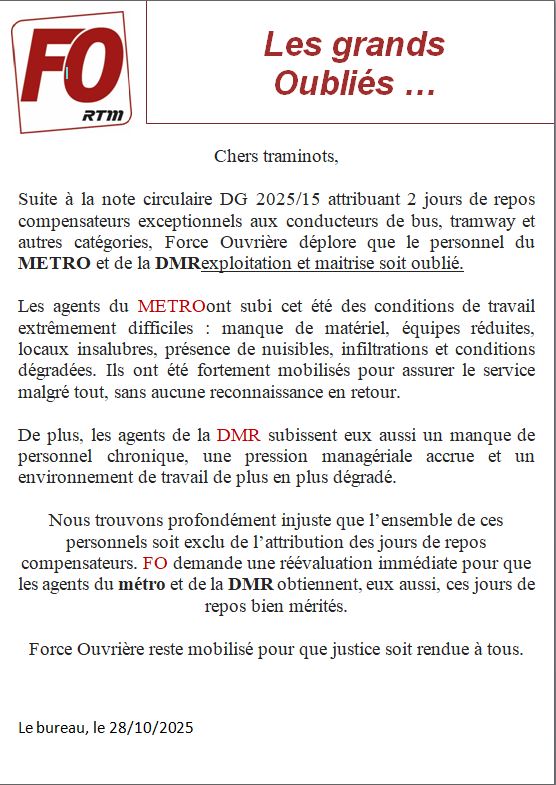 Suite à la note circulaire DG 2025/15 attribuant 2 jours de repos compensateurs exceptionnels aux conducteurs de bus, tramway et autres catégories, FO RTM déplore que le personnel du METRO et de la DMR exploitation et maitrise soit oublié.