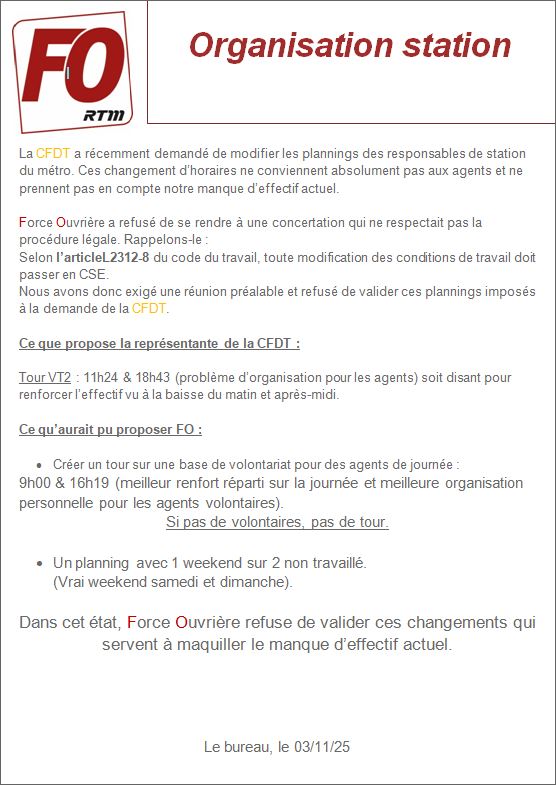 FO RTM a refusé de se rendre à une concertation qui ne respectait pas la procédure légale. Rappelons-le : Selon l’article L2312-8 du code du travail, toute modification des conditions de travail doit passer en CSE. Nous avons donc exigé une réunion préalable et refusé de valider ces plannings imposés à la demande de la CFDT.