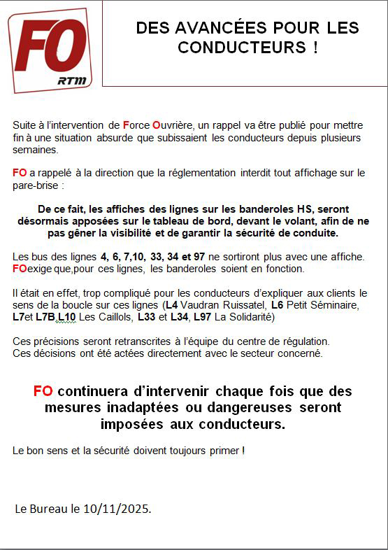 Les bus des lignes 4, 6, 7,10, 33, 34 et 97 ne sortiront plus avec une affiche. FO RTM exige que, pour ces lignes, les banderoles soient en fonction.