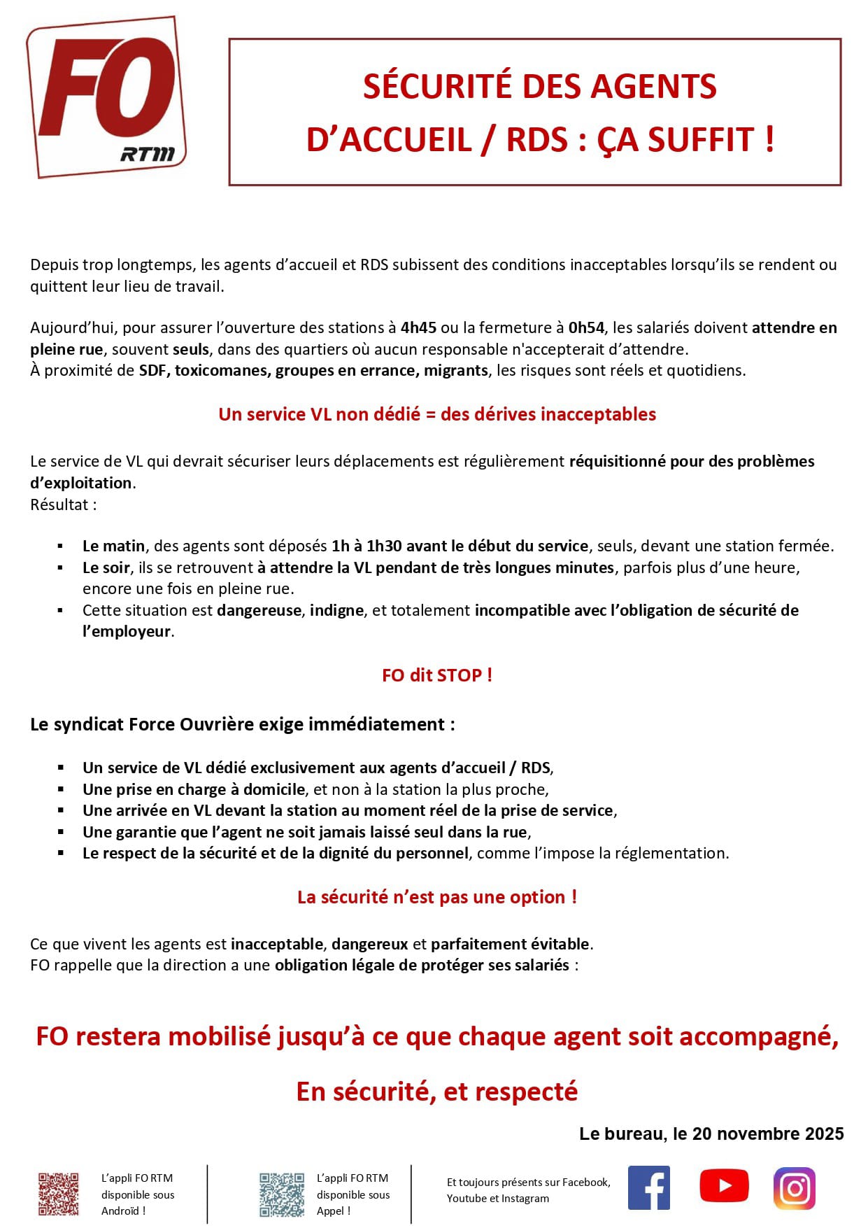 Ce que vivent les agents est inacceptable, dangereux et parfaitement évitable. FO RTM rappelle que la direction a une obligation légale de protéger ses salariés :