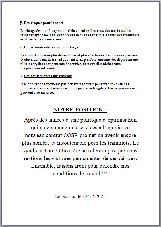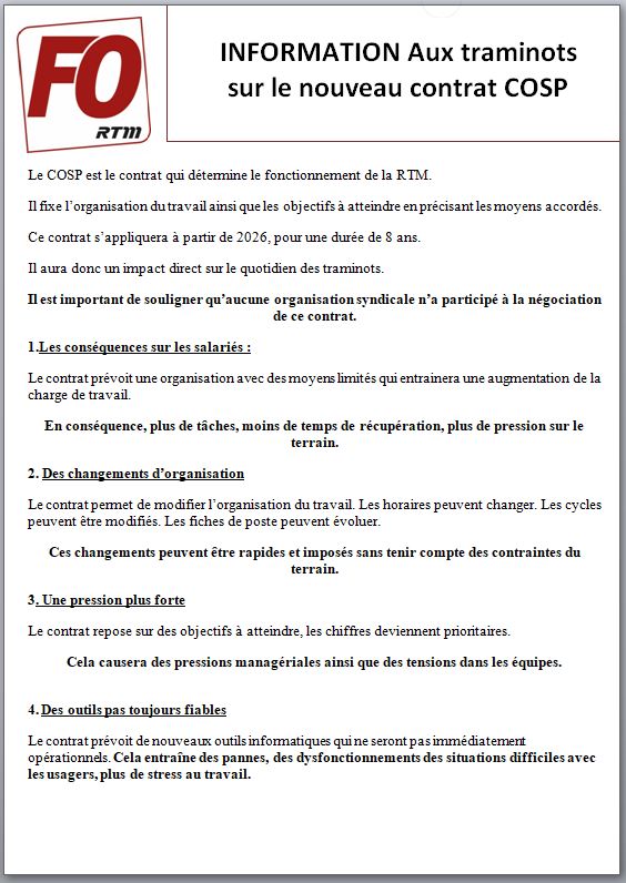 Après des années d’une politique d’optimisation qui a déjà mené nos services à l’agonie, ce nouveau contrat COSP promet un avenir encore plus sombre et insoutenable pour les traminots. Le syndicat FO RTM ne tolèrera pas que nous restions les victimes permanentes de ces dérives. Ensemble, faisons front pour défendre nos conditions de travail !!!