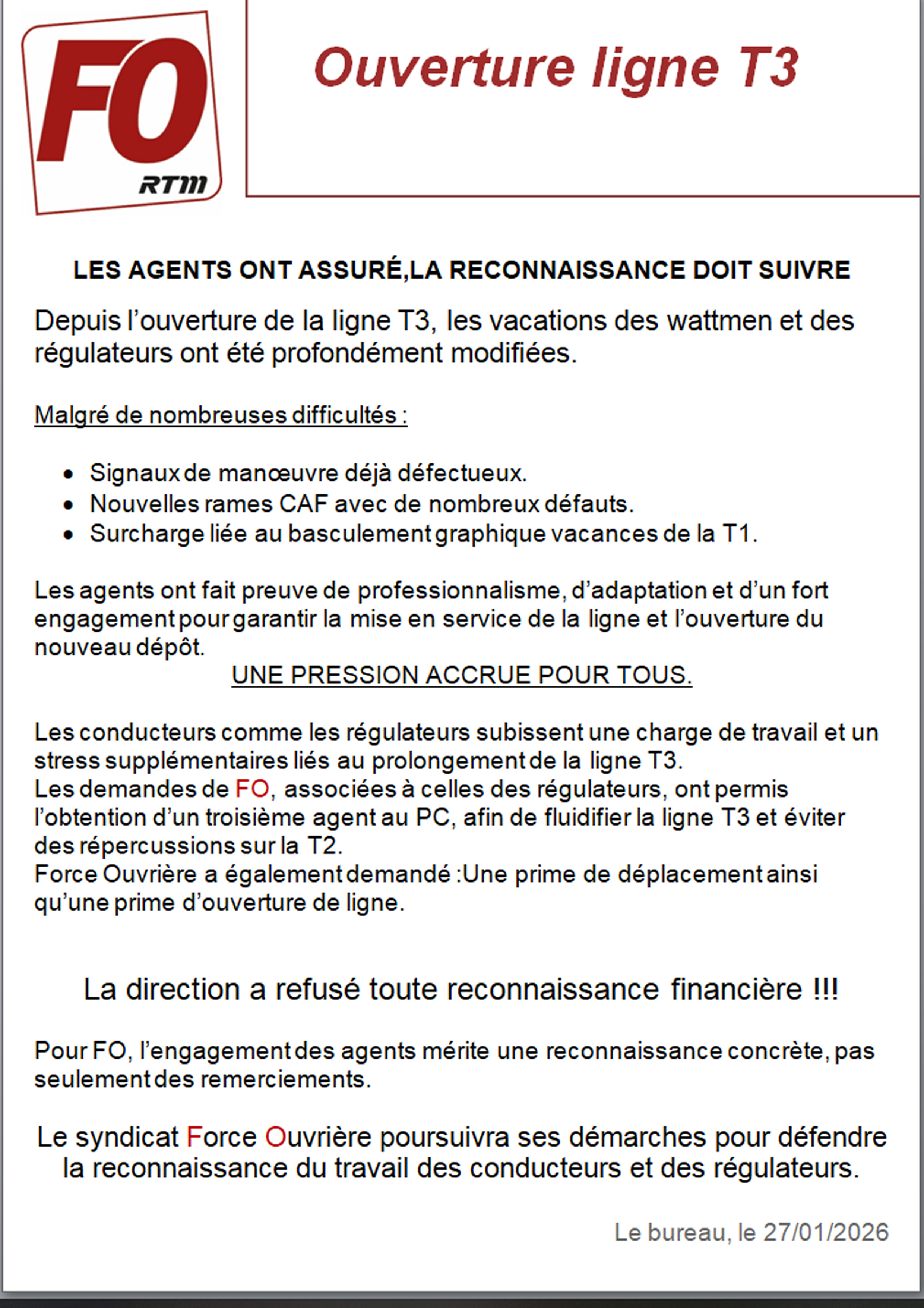 Les conducteurs comme les régulateurs subissent une charge de travail et un stress supplémentaires liés au prolongement de la ligne T3 . Les demandes de FO RTM, associées à celles des régulateurs, ont permis l’obtention d’un troisième agent au PC, afin de fluidifier la ligne T3 et éviter des répercussions sur la T2 . FO RTM a également demandé : Une prime de déplacement ainsi qu’une prime d’ouverture de ligne.
