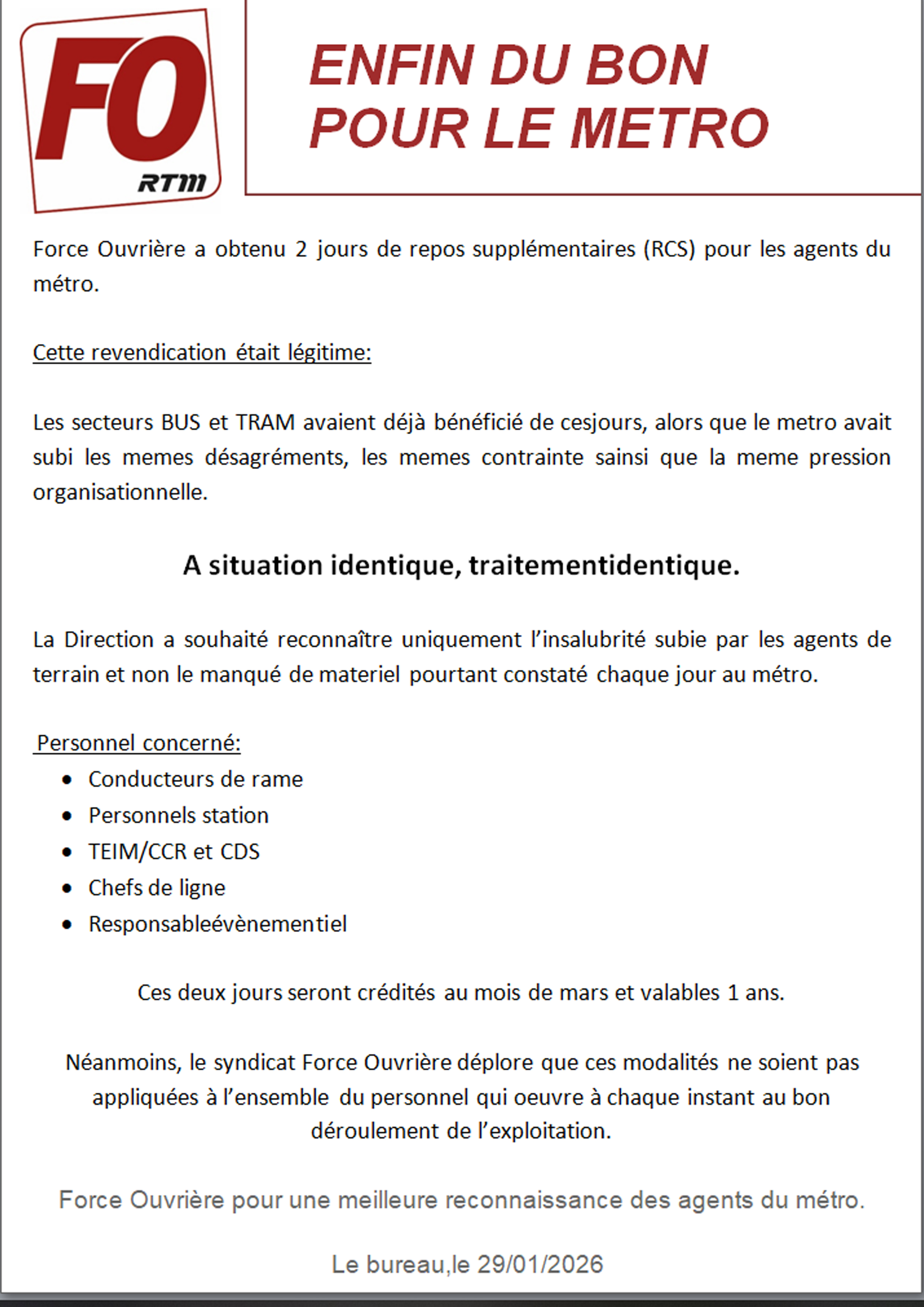 FO RTM a obtenu 2 jours de repos supplémentaires (RCS) pour les agents du métro.