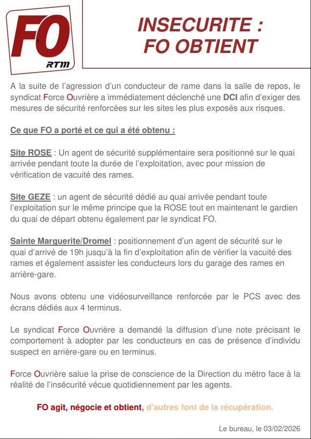 A la suite de l’agression d’un conducteur de rame dans la salle de repos, le syndicat FO RTM a immédiatement déclenché une DCI afin d’exiger des mesures de sécurité renforcées sur les sites les plus exposés aux risques.